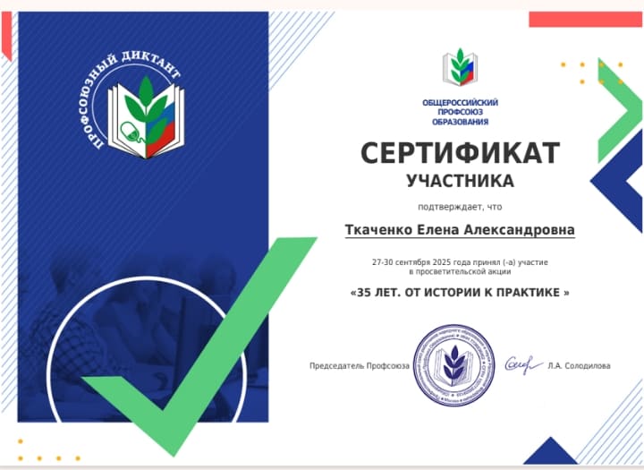 Сертификат участника подтверждает,что Ткаченко Елена Александровна 27-30 сентября 2025 года приняла участие в просветительской акции "35 лет от истории к практике"